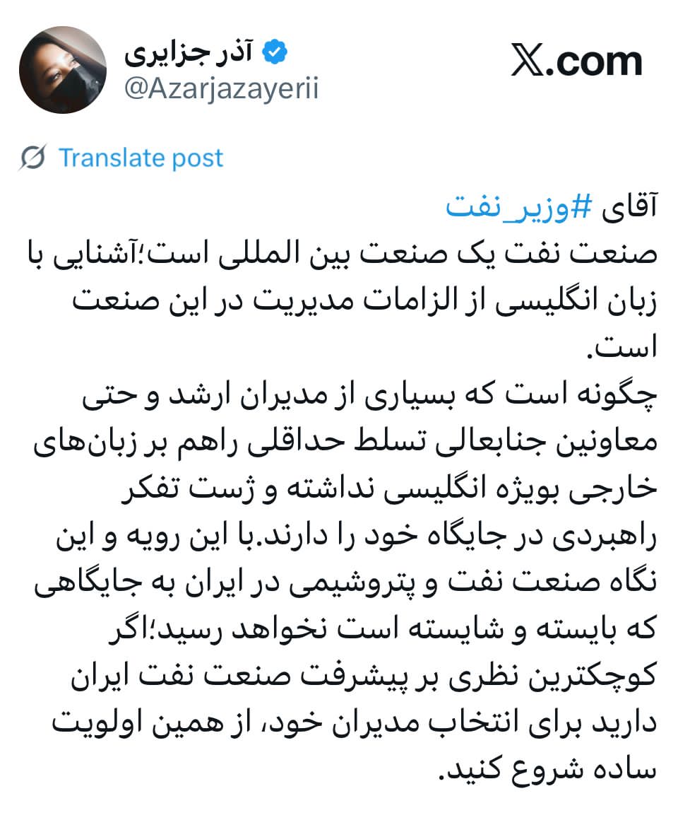 چگونه است که بسیاری از مدیران ارشد و حتی معاونین جنابعالی تسلط حداقلی راهم بر زبانهای خارجی بویژه انگلیسی نداشته و ژست تفکر راهبردی در جایگاه خود را دارند.با این رویه و این نگاه صنعت نفت و پتروشیمی در ایران به جایگاهی که بایسته و شایسته است نخواهد رسید؛اگر کوچکترین نظری بر پیشرفت صنعت نفت ایران دارید برای انتخاب مدیران خود، از همین اولویت ساده شروع کنید.