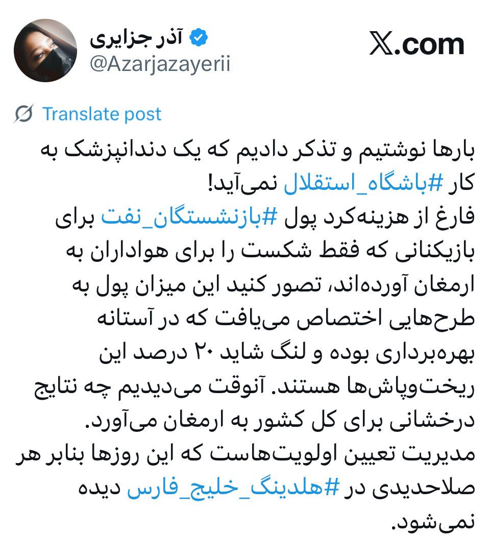 فارغ از هزینه‌کرد پول بازنشستگان نفت برای بازیکنانی که فقط شکست را برای هواداران به ارمغان آورده‌اند،تصور کنید این میزان پول به طرح‌هایی اختصاص می‌یافت که در آستانه بهره‌برداری بوده و لنگ شاید ۲۰ درصد این ریخت و پاش‌ها هستند.آنوقت می‌دیدیم چه نتایج درخشانی برای کل کشور به ارمغان می‌آورد.