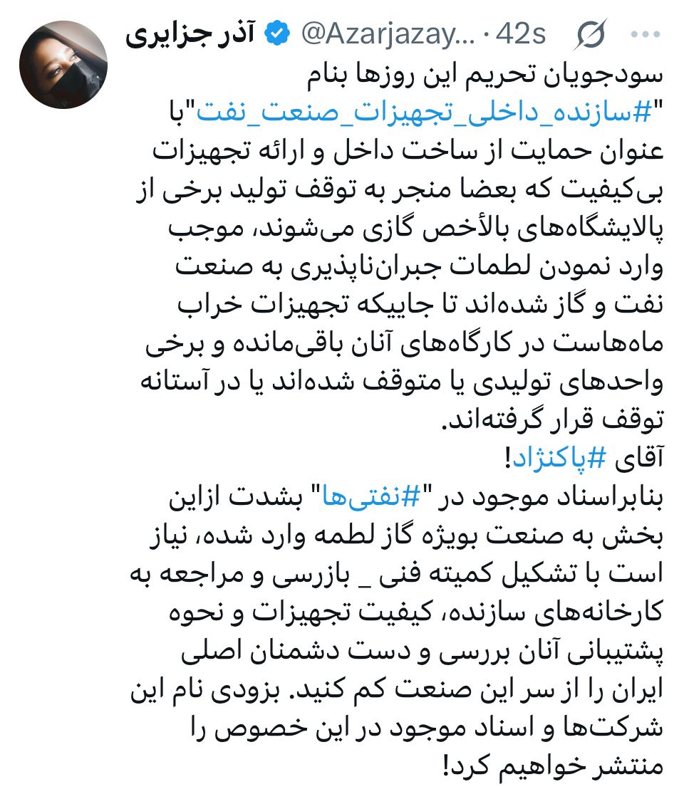 آقای پاکنژاد! بنابراسناد موجود در "نفتیها" بشدت ازاین بخش به صنعت بویژه گاز لطمه وارد شده، نیاز است با تشکیل کمیته فنی - بازرسی و مراجعه به کارخانههای سازنده، کیفیت تجهیزات و نحوه پشتیبانی آنان بررسی و دست دشمنان اصلی ایران را از سر این صنعت کم کنید. بزودی نام این شرکتها و اسناد موجود در این خصوص را منتشر خواهیم کرد.