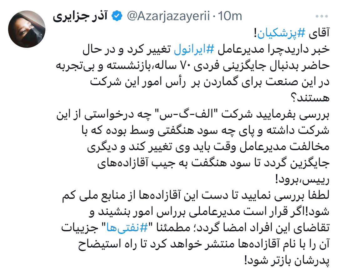 لطفا بررسی نمایید تا دست این آقازادهها از منابع ملی کم شود!اگر قرار است مدیرعاملی برراس امور بنشیند و تقاضای این افراد امضا گردد؛ مطمئنا "نفتیها" جزییات آن را با نام آقازادهها منتشر خواهد کرد تا راه استیضاح پدرشان بازتر شود!