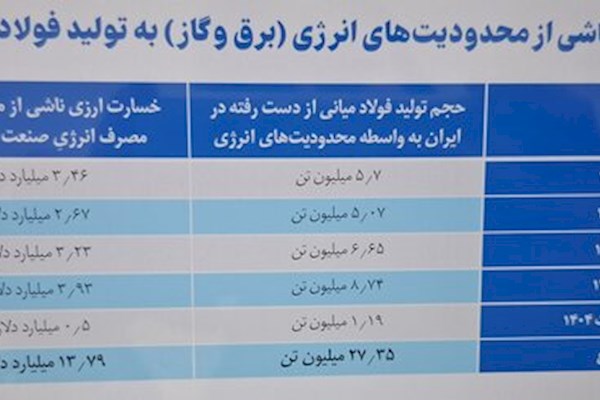 با وجود آنکه سهم صنعت فولاد از مصرف گاز کشور به طور میانگین تنها حدود ۵ درصد است، در زمان اعمال محدودیتهای انرژی، این بخش معمولاً نخستین صنعتی است که با محدودیت مواجه میشود. بر اساس برآوردها، محدودیتهای گاز و برق موجب میشود صنعت فولاد سالانه بین ۳ تا ۵ میلیارد دلار از ظرفیت تولید خود را از دست بدهد.