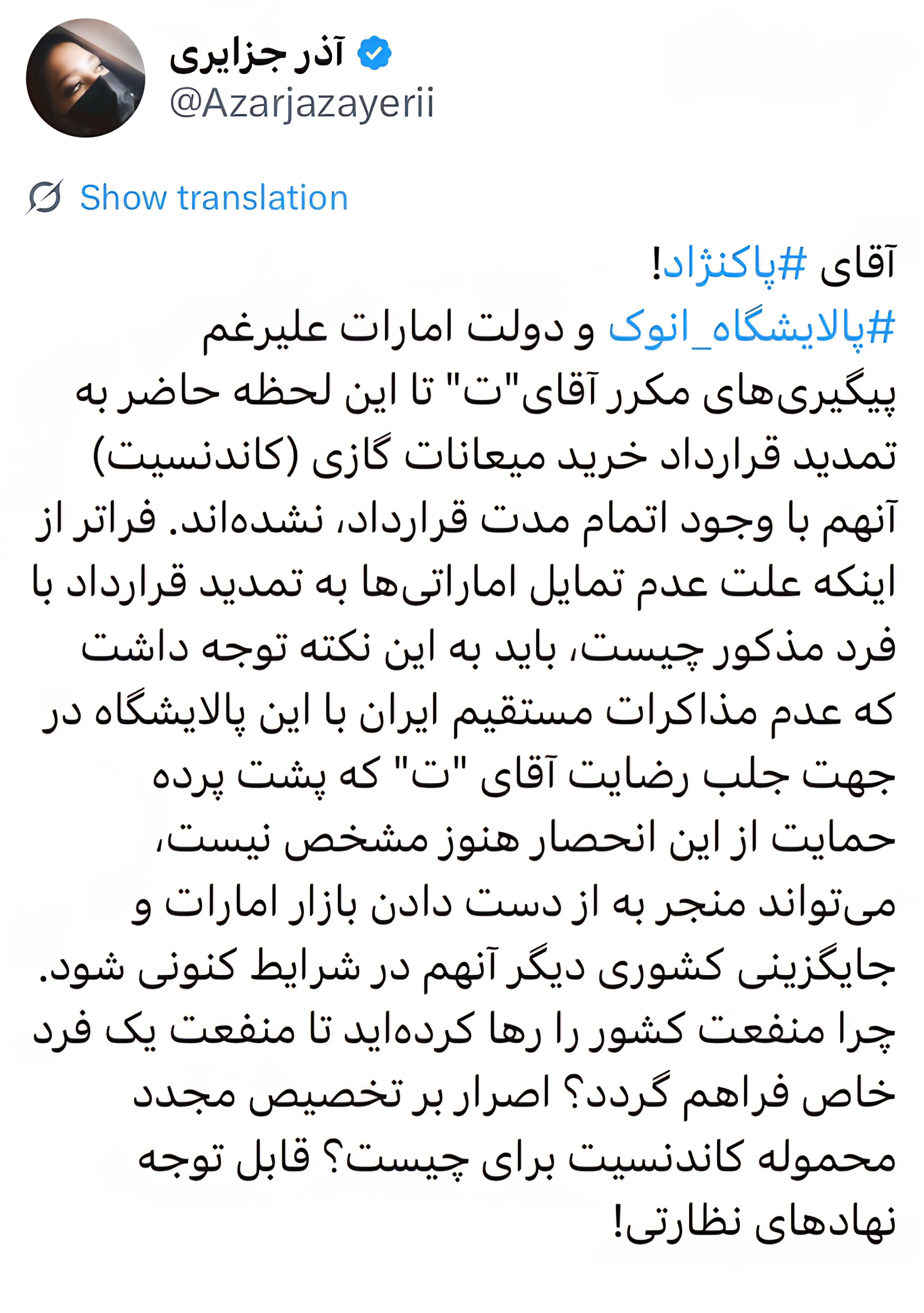 پالایشگاه انوک و دولت امارات علیرغم پیگیریهای مکرر آقای"ت" تا این لحظه حاضر به تمدید قرارداد خرید میعانات گازی (کاندنسیت) آنهم با وجود اتمام مدت قرارداد، نشدهاند. فراتر از اینکه علت عدم تمایل اماراتیها به تمدید قرارداد با فرد مذکور چیست، باید به این نکته توجه داشت که عدم مذاکرات مستقیم ایران با این پالایشگاه در جهت جلب رضایت آقای "ت" که پشت پرده حمایت از این انحصار هنوز مشخص نیست،میتواند منجر به از دست دادن بازار امارات و جایگزینی کشوری دیگر آنهم در شرایط کنونی شود. چرا منفعت کشور را رها کردهاید تا منفعت یک فرد خاص فراهم گردد؟ اصرار بر تخصیص مجدد محموله کاندنسیت برای چیست؟ قابل توجه نهادهای نظارتی!