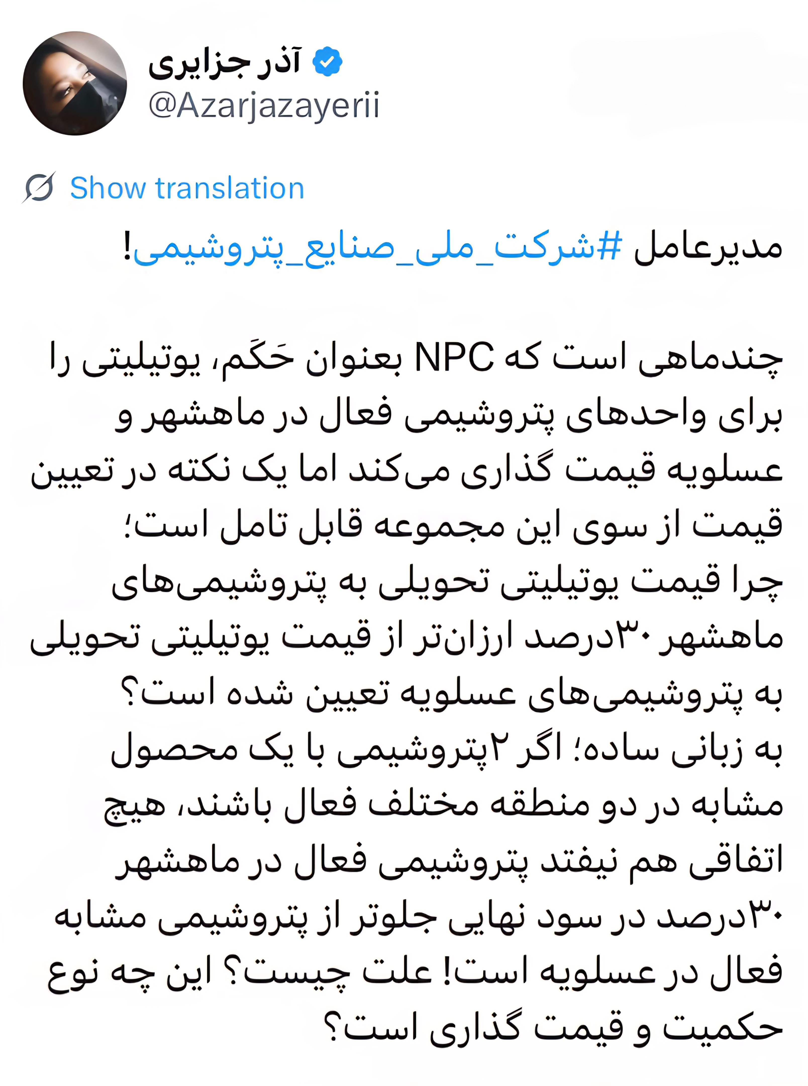 به زبانی ساده؛ اگر ۲پتروشیمی با یک محصول مشابه در دو منطقه مختلف فعال باشند، هیچ اتفاقی هم نیفتد پتروشیمی فعال در ماهشهر ۳۰درصد در سود نهایی جلوتر از پتروشیمی مشابه فعال در عسلویه است! علت چیست؟ این چه نوع حکمیت و قیمت گذاری است؟