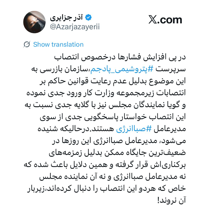 نفتی ها /در پی افزایش فشارها درخصوص انتصاب سرپرست پتروشیمی پادجم،سازمان بازرسی به این موضوع بدلیل عدم رعایت قوانین حاکم بر انتصابات زیرمجموعه وزارت کار ورود جدی نموده و گویا نمایندگان مجلس نیز با گلایه جدی نسبت به این انتصاب خواستار پاسخگویی جدی از سوی مدیرعامل صباانرژی هستند.درحالیکه شنیده میشود،مدیرعامل صباانرژی این روزها در ضعیفترین جایگاه ممکن بدلیل زمزمههای برکناریاش قرار گرفته و همین دلایل باعث شده که نه مدیرعامل صباانرژی و نه آن نماینده مجلس خاص که هردو این انتصاب را دنبال کردهاند،زیربار آن نروند!