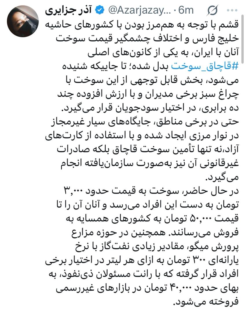 در حال حاضر، سوخت به قیمت حدود ۳,۰۰۰ تومان به دست این افراد می‌رسد و آنان آن را تا قیمت ۵۰,۰۰۰ تومان به کشورهای همسایه به فروش می‌رسانند. همچنین در حوزه مزارع پرورش میگو، مقادیر زیادی نفت‌گاز با نرخ یارانه‌ای ۳۰۰ تومان به ازای هر لیتر در اختیار برخی افراد قرار گرفته که با رانت مسئولان ذی‌نفوذ، به بهای حدود ۴۰,۰۰۰ تومان در بازارهای غیررسمی فروخته می‌شود.