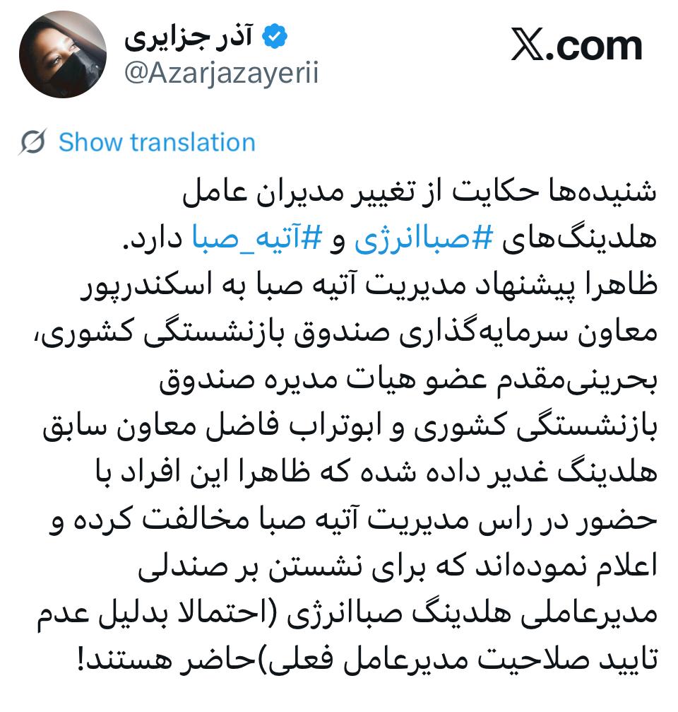 ظاهرا پیشنهاد مدیریت آتیه صبا به اسکندرپور معاون سرمایهگذاری صندوق بازنشستگی کشوری،بحرینیمقدم عضو هیات مدیره صندوق بازنشستگی کشوری و ابوتراب فاضل معاون سابق هلدینگ غدیر داده شده که ظاهرا این افراد با حضور در راس مدیریت آتیه صبا مخالفت کرده و اعلام نمودهاند که برای نشستن بر صندلی مدیرعاملی هلدینگ صباانرژی (احتمالا بدلیل عدم تایید صلاحیت مدیرعامل فعلی)حاضر هستند!