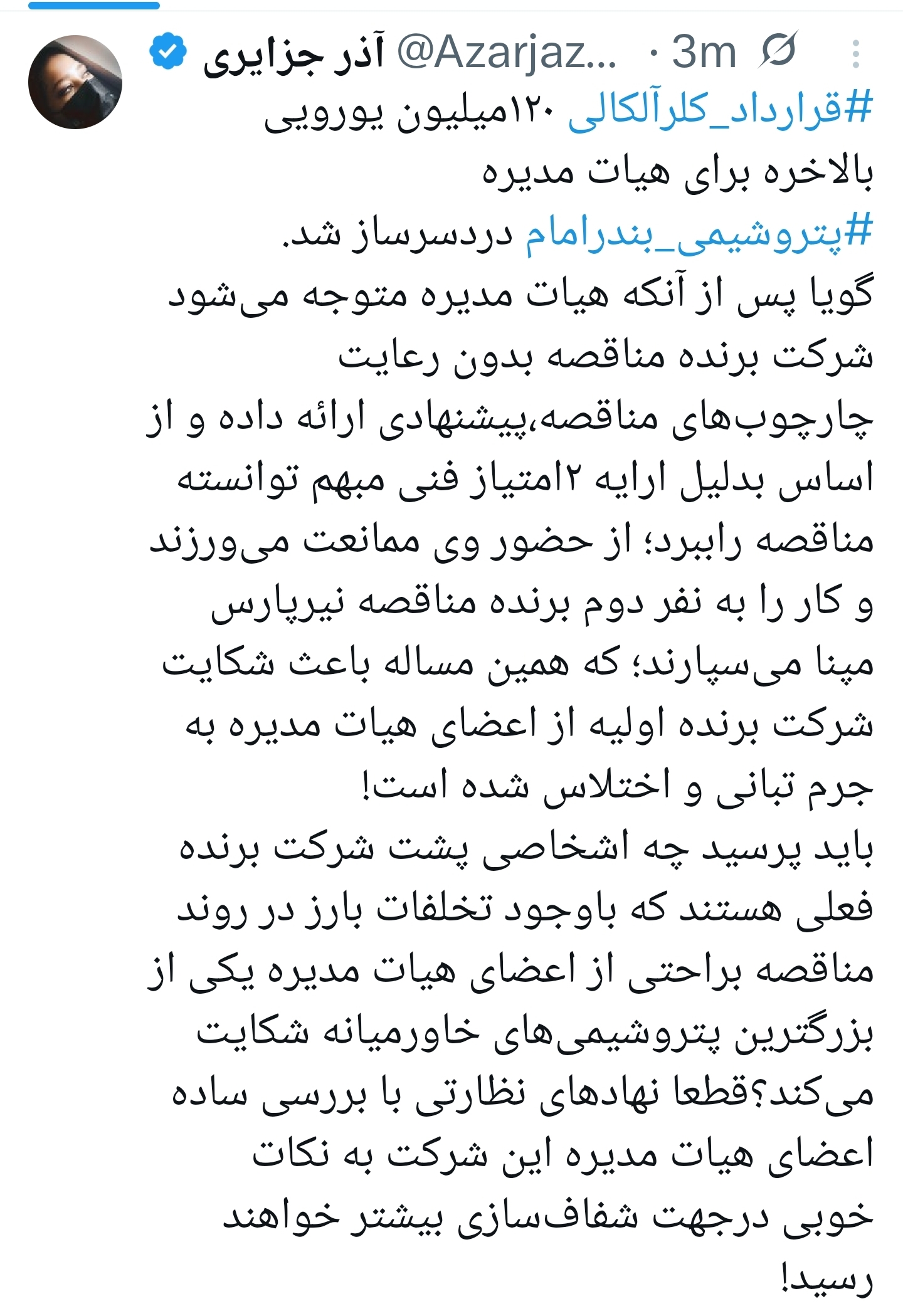 باید پرسید چه اشخاصی پشت شرکت برنده فعلی هستند که باوجود تخلفات بارز در روند مناقصه براحتی از اعضای هیات مدیره یکی از بزرگترین پتروشیمیهای خاورمیانه شکایت میکند؟قطعا نهادهای نظارتی با بررسی ساده اعضای هیات مدیره این شرکت به نکات خوبی درجهت شفافسازی بیشتر خواهند رسید!
