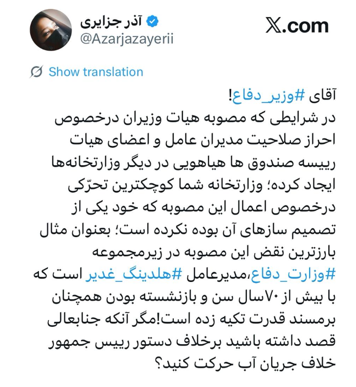 در شرایطی که مصوبه هیات وزیران درخصوص احراز صلاحیت مدیران عامل و اعضای هیات رییسه صندوق ها هیاهویی در دیگر وزارتخانهها ایجاد کرده؛ وزارتخانه شما کوچکترین تحرّکی درخصوص اعمال این مصوبه که خود یکی از تصمیم سازهای آن بوده نکرده است؛بعنوان مثال بارزترین نقض این مصوبه در زیرمجموعه وزارت دفاع،مدیرعامل هلدینگ غدیر است که با بیش از ۷۰سال سن و بازنشسته بودن همچنان برمسند قدرت تکیه زده است!مگر آنکه جنابعالی قصد داشته باشید برخلاف دستور رییس جمهور خلاف جریان آب حرکت کنید؟