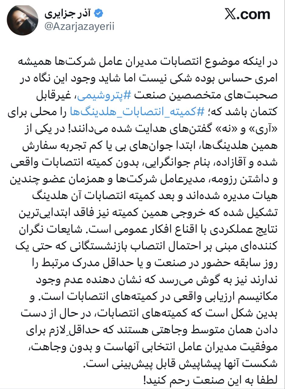میگویند:در یکی از همین هلدینگها، ابتدا جوانهای بی یا کم تجربه سفارش شده و آقا زاده، بنام جوانگرایی و یا بهادادن به بانوان،بدون کمیته انتصابات واقعی و داشتن رزومه، مدیرعامل شرکتها و همزمان عضو هیات مدیره چند شرکت دیگر شدهاند و بعد کمیته انتصابات آن هلدینگ تشکیل شده که خروجی همین کمیته نیز فاقد ابتداییترین نتایج عملکردی با اقناع افکار عمومی مجموعه متخصصین نجیب و صبور این صنعت میباشد و شایعات نگران کنندهای مبنی بر احتمال انتصاب بازنشستگانی که حتی یک روز سابقه حضور در صنعت و یا حداقل مدرک مرتبط را ندارند نیز به گوش میرسد که نشان دهنده عدم وجود مکانیسم ارزیابی واقعی در کمیتههای انتصابات است.
