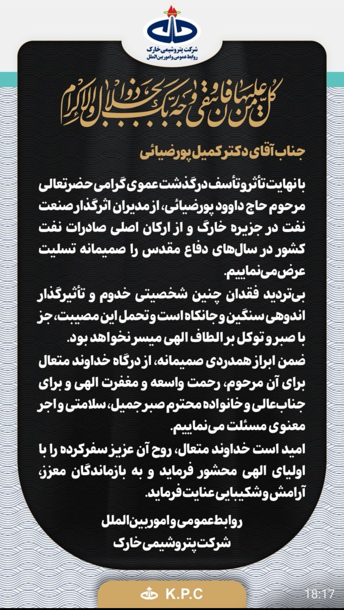 در پی درگذشت حاج داوود پورضیائی، از مدیران تأثیرگذار صنعت نفت و از پیشکسوتان جزیره خارک، شرکت پتروشیمی خارک با صدور پیامی این مصیبت را به بازماندگان تسلیت گفت و برای آن مرحوم رحمت الهی مسئلت کرد.