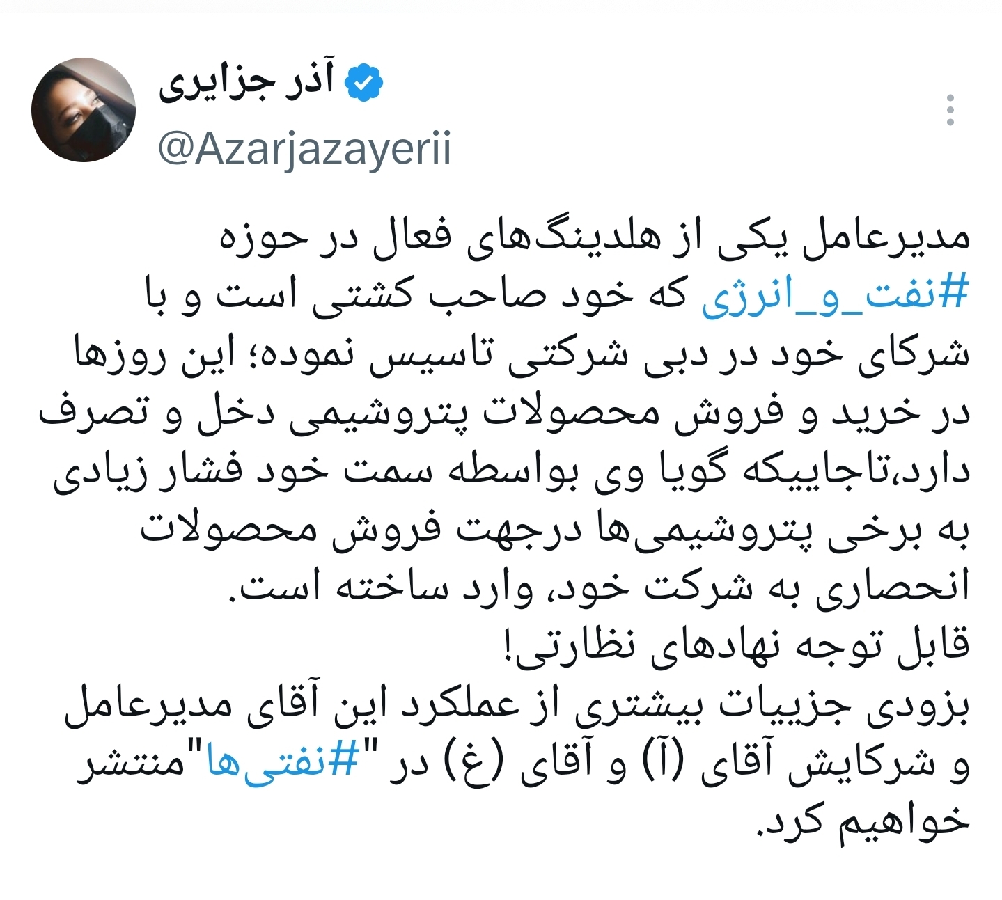 نفتی ها /مدیرعامل یکی از هلدینگهای فعال در حوزه نفت و انرژی که خود صاحب کشتی است و با شرکای خود در دبی شرکتی تاسیس نموده؛ این روزها در خرید و فروش محصولات پتروشیمی دخل و تصرف دارد،تاجاییکه گویا وی بواسطه سمت خود فشار زیادی به برخی پتروشیمیها درجهت فروش محصولات انحصاری به شرکت خود، وارد ساخته است.