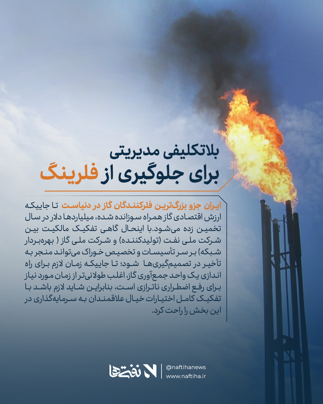 نفتی ها /ایران جزو بزرگترین فلرکنندگان گاز در دنیاست تا جاییکه ارزش اقتصادی گاز همراه سوزانده شده، میلیاردها دلار در سال تخمین زده میشود.با اینحال گاهی تفکیک مالکیت بین شرکت ملی نفت (تولیدکننده) و شرکت ملی گاز ( بهرهبردار شبکه) بر سر تأسیسات و تخصیص خوراک میتواند منجر به تأخیر در تصمیمگیریها شود؛ تا جاییکه زمان لازم برای راهاندازی یک واحد جمعآوری گاز، اغلب طولانیتر از زمان مورد نیاز برای رفع اضطراری ناترازی است، بنابراین شاید لازم باشد با تفکیک کامل اختیارات خیال علاقمندان به سرمایهگذاری در این بخش را راحت کرد.