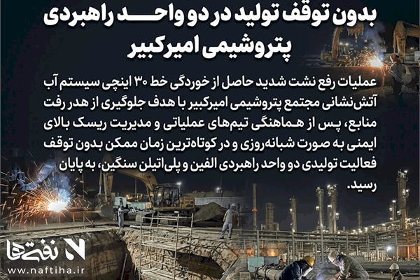 این عملیات حساس با هدف جلوگیری از هدررفت منابع و با در نظر گرفتن شرایط سخت آبوهوایی انجام شد. در جریان این عملیات، خط اصلی Fire Water واحدهای الفین و پلیاتیلن سنگین شرکت پتروشیمی امیرکبیر بهصورت کنترلشده و همزمان قطع شد و پس از اجرای دقیق عملیات تعمیراتی، در کوتاهترین زمان ممکن به مدار بهرهبرداری بازگشت.