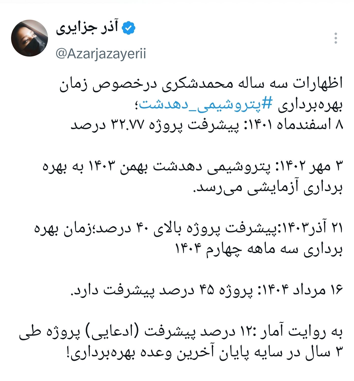 نفتی ها /اظهارات سه ساله محمدشکری درخصوص زمان بهرهبرداری پتروشیمی دهدشت؛
