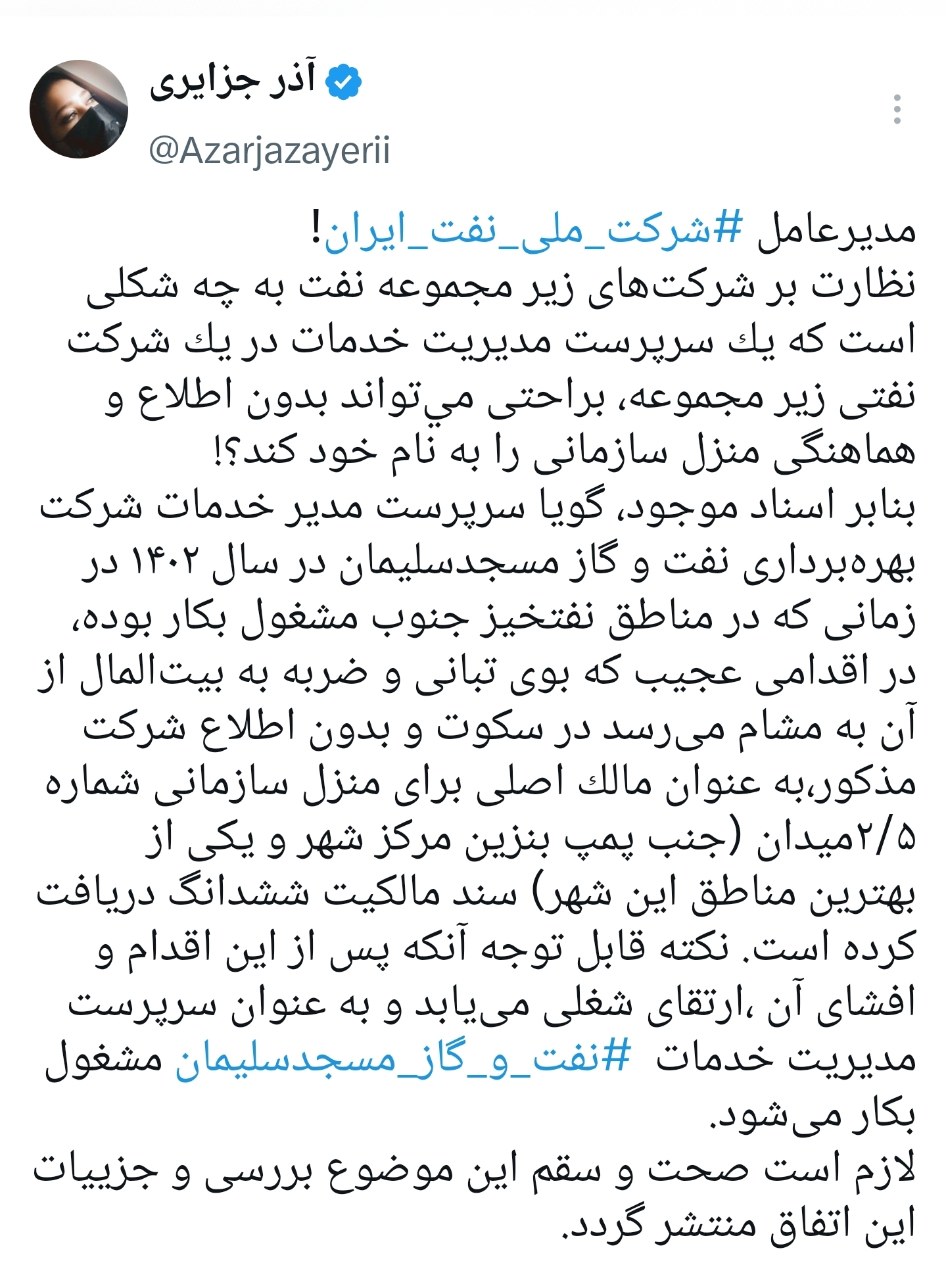 بنابر اسناد موجود، گویا سرپرست مدیر خدمات شرکت بهرهبردارى نفت و گاز مسجدسلیمان در سال ۱۴۰۲ در زمانی که در مناطق نفتخیز جنوب مشغول بکار بوده، در اقدامى عجیب که بوى تبانى و ضربه به بیتالمال از آن به مشام مىرسد در سکوت و بدون اطلاع شرکت مذکور،به عنوان مالک اصلى براى منزل سازمانى شماره ۲/۵ میدان (جنب پمپ بنزین مرکز شهر و یکى از بهترین مناطق این شهر) سند مالکیت ششدانگ دریافت کرده است. نکته قابل توجه آنکه پس از این اقدام و افشای آن ،ارتقای شغلی مییابد و به عنوان سرپرست مدیریت خدمات نفت و گاز مسجد سلیمان مشغول بکار میشود.