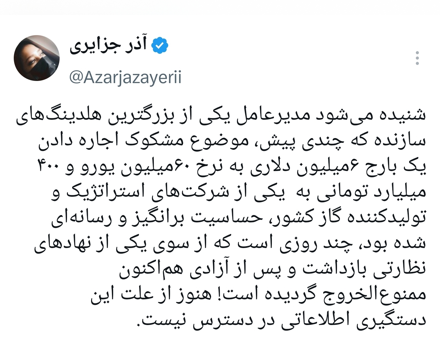 نفتی ها /شنیده میشود مدیرعامل یکی از بزرگترین هلدینگهای سازنده که چندی پیش، موضوع مشکوک اجاره دادن یک بارج ۶میلیون دلاری به نرخ ۶۰میلیون یورو و ۴۰۰ میلیارد تومانی به یکی از شرکتهای استراتژیک و تولیدکننده گاز کشور، حساسیت برانگیزو رسانهای شده بود،چند روزی است که از سوی یکی از نهادهای نظارتی بازداشت و پس از آزادی هم اکنون ممنوع الخروج گردیده است!هنوز از علت این دستگیری اطلاعاتی در دسترس نیست.