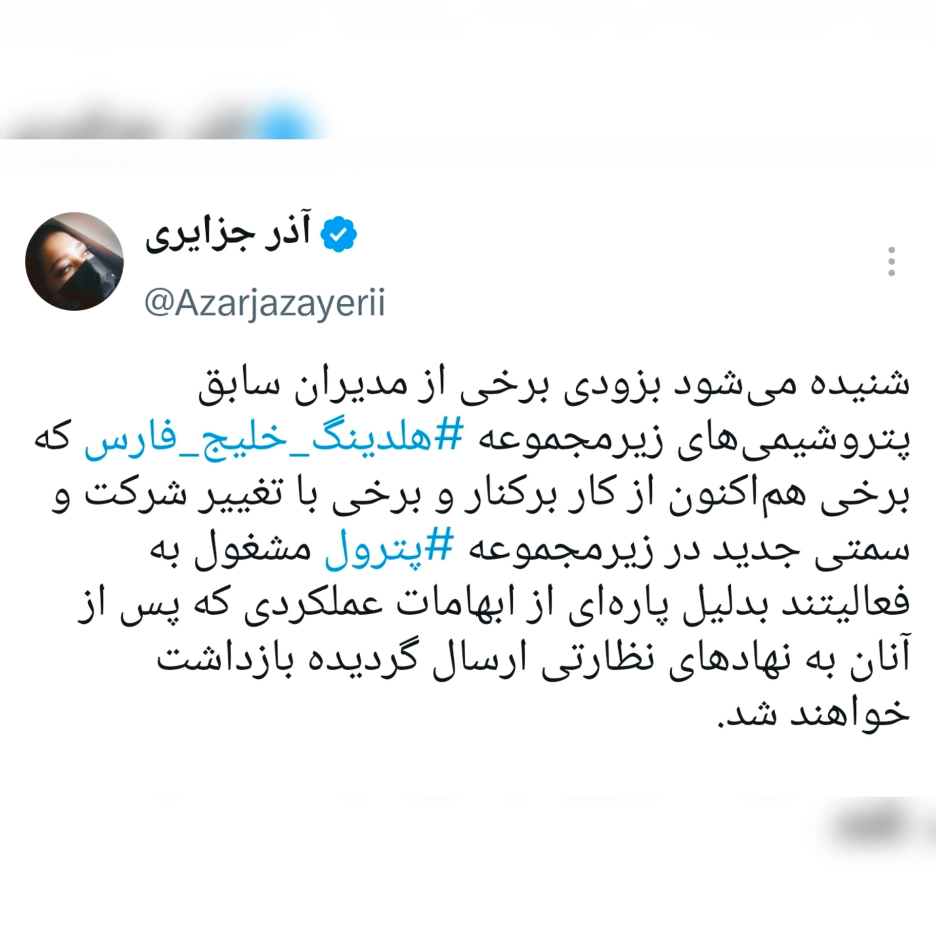 نفتی ها /شنیده میشود بزودی برخی از مدیران سابق پتروشیمی های زیرمجموعه هلدینگ خلیج فارس که برخی هم اکنون از کار برکنار و برخی با تغییر شرکت و سمتی جدید در زیرمجموعه پترول مشغول بفعالیتند بدلیل پاره ای از ابهامات عملکردی که پس از آنان به نهادهای نظارتی ارسال گردیده بازداشت خواهند شد.