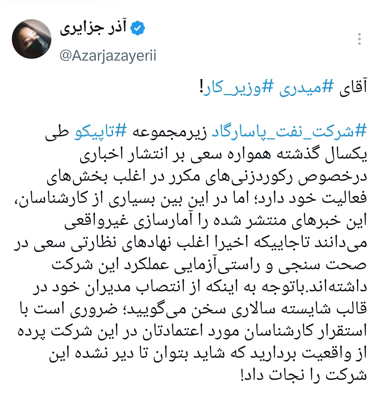 آقای میدری وزیر کار! شرکت نفت پاسارگاد زیرمجموعه تاپیکو طی یکسال گذشته همواره سعی بر انتشار اخباری درخصوص رکوردزنی‌های مکرر در اغلب بخش‌های فعالیت خود دارد؛اما در این بین بسیاری از کارشناسان، این خبرهای منتشر شده را آمارسازی غیرواقعی می‌دانند تاجاییکه ...